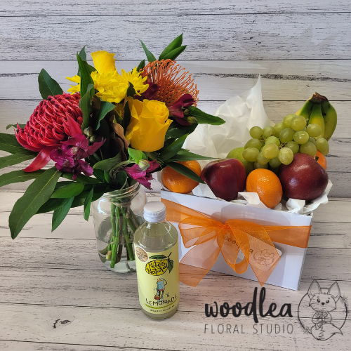 Freshen up someone's day with this bright and happy gift box- fresh seasonal fruit paired with a bottle of locally made Pete's Naturals soda and a jar full of bright, flowers.